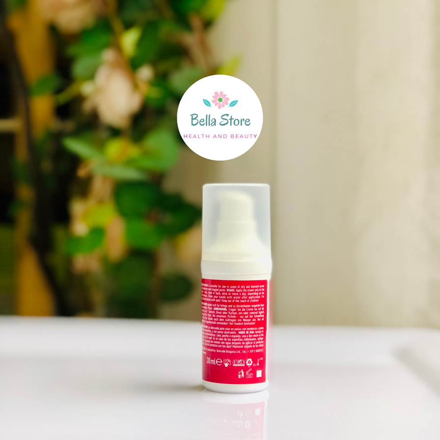 Thành phần gồm Vitamin A và Vitamin E, nước hoa hồng hữu cơ Rosa Damascena giúp làm dịu vết đỏ và viêm, giảm lượng vi khuẩn gây viêm, điều hoà sự tiết bã nhờn quá mức, ngăn ngừa mụn nhọt xuất hiện, làm sáng da, mờ vết thâm, không làm chai nốt mụn.
